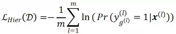 分析边缘概率的计算公式,我们可以发现:(1)图中某个标签 的边缘概率依赖于该标签所有的父类节点分数值之和,因为该标签赋值为 1 则其所有的 父节点都应该赋值 1 才能满足层级约束关系。因此,边缘概率的计算可以使得父节点的 分数值影响子节点的预测值。(2)计算层级中间标签的边缘概率时需要包含其所有子类标签对应的联合概率,即可以聚集来自子类的知识。最后,给定 m 个训练样本