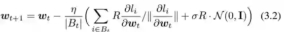 g_i 是 一个数据点的梯度(per-sample gradient),R 是 clipping threshold, sigma 是 noise multiplier。
