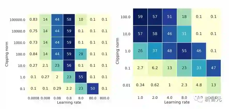 其实,这意味着 DP 训练减少了一个数量级的调参工作:假设学习率和 R 各调 5 个值(如上图) ,那就要测 25 种组合才能找到最优超参数。现在只需要调学习率 5 种可能就好,调参效率提高了数倍,这是对业界来说极有价值的痛点问题。