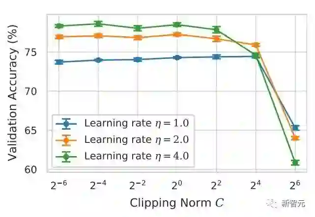 这篇文章前两个贡献其实非常 empirical,也很难深挖。而最后一个贡献很有意思 我仔细看了看超参数的 ablation study 发现一个原作者没有发现的点:在 clipping threshold 足够小的时候,其实 clipping threshold(也就是 clipping norm C,在上面的公式中和 R 是一个变量)没有作用。