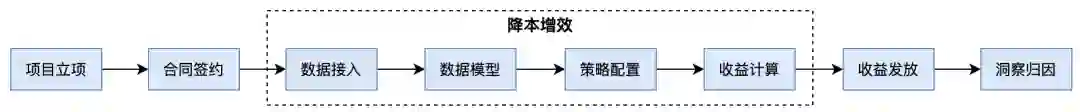 从业务层角度而言,一个项目的结算过程可以分为以下几个步骤:立项、签约、数据接入、数据模型、策略配置、收益计算、收益发放、洞察归因等过程。如下图所示: