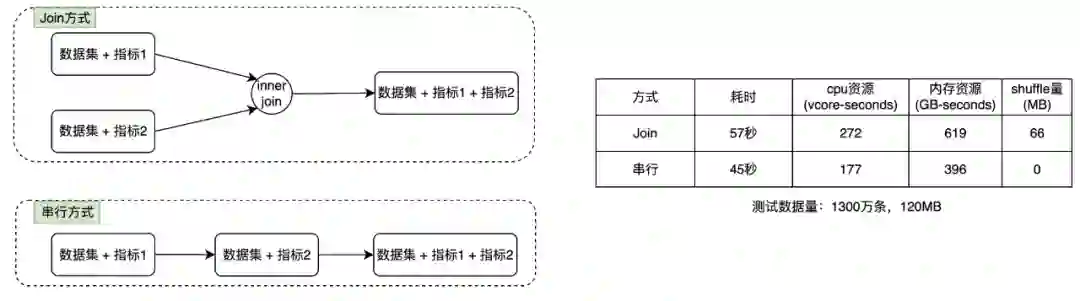 为了证明串行执行的性能更佳,我们也做了简单的实验来进行对比,从耗时、内存消耗、cpu 消耗三个维度进行对比分析,如下图所示,可以看到串行执行的性能全面优于 Join 执行。