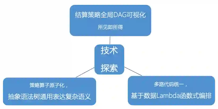 从技术上来说,平台化主要做了以下几个探索:结算策略全局 DAG 可视化,策略算子原子化,多路代码统一,如下图所示:
