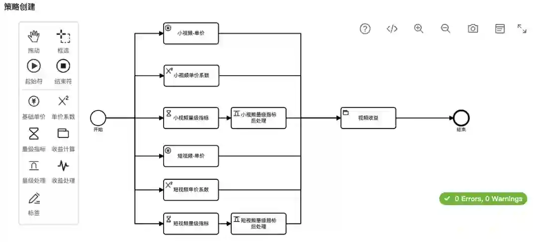 流程编排:结算策略是插件的 DAG 组合。结合策略需要,我们定义了 6 种插件,每种插件表达式的输出是一种类型的变量,分为:单价插件、单价系数插件、量级插件、量级处理插件、收益插件、收益处理插件。在可视化页面上通过拖拽的方式将插件编排成 DAG 图,后面的插件可以引用前面插件的输出结果作为输入变量,DAG 的结束节点必须为收益插件,其结果用作收益发放的金额,这样就构建出一个结算策略了。