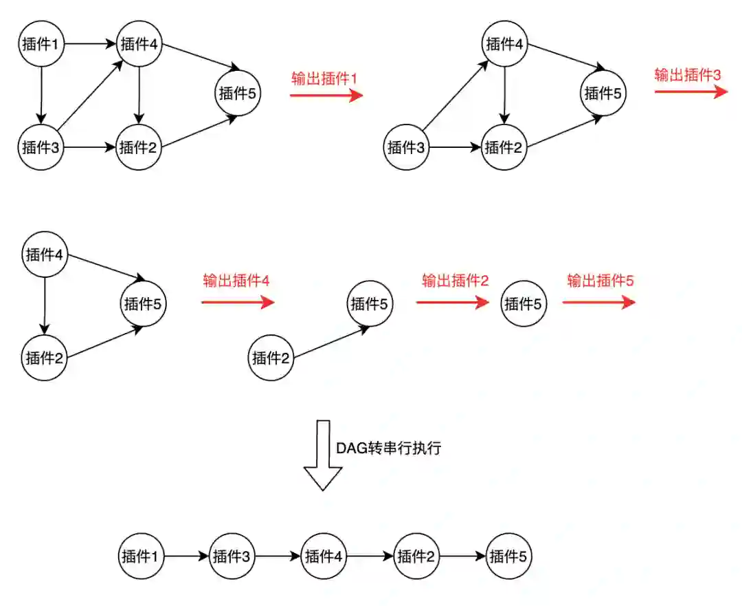DAG 转串行执行:由于插件没有改变数据集的粒度,相当于在原数据集上添加新的列,因而可以采用串行执行的思路来规避 join 的出现。调度系统通过拓扑排序对 DAG 中的插件进行排序,然后串行执行每个插件,一次只执行一个插件,上游插件在执行完毕后将结果作为中间变量传递给下游,从而保障了下游插件在计算前上游插件都已经计算完毕。由于插件使用到了集合指标作为表达式输入,因此不能按条执行每条数据,为了简化计算我们全链路采用 SQL 表达式进行集合计算。这样既避免了数据 join 的操作,也在同等语意下节省了计算资源。