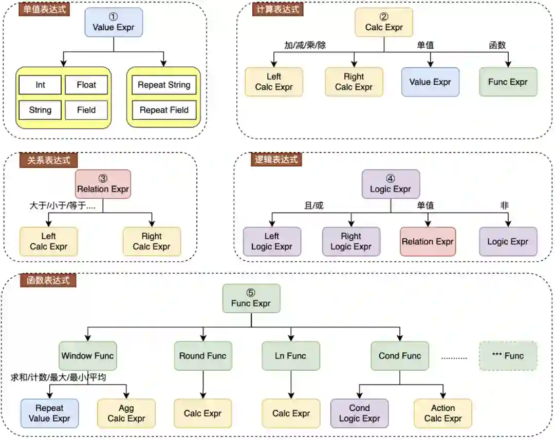 插件表达式:插件可以理解成一个表达式计算,我们借鉴了 SQL 引擎的 ExpressionTree 方案。表达式的定义通 pb 协议描述,我们将表达式分为 5 种基础类:①单值表达式、②计算表达式、③逻辑表达式、④关系表达式、⑤函数表达式,其中函数又可以细分成多种,表达式之间可以进行嵌套、组合,从而其描述能力是可扩展的。之所以抽象成 5 种类型,主要是参考了 SQL 的语法元素,并考虑结算业务的需要,目标是能覆盖所有的策略场景,并以结构化的形式表现出来。