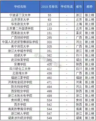 除以上四类学校之外,另有24所新进高校,其中表现最为亮眼的非宁波诺丁汉大学莫属。宁波诺丁汉大学于2005年才被教育部正式批准设立,距今只有14年办学时间,此次新入榜单便高居全国百强,位列第55位;除宁波诺丁汉大学之外,北京语言大学也是新进高校,同时也进入全国百强,位列第63位。两所新进高校的的优异表现确实即令人赞许又令人惊叹。24所新进高校如下表5: