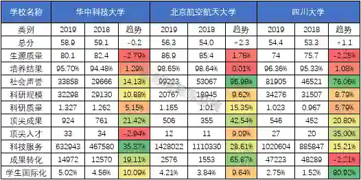 首先先看第一类:顶尖高校的变动情况。在今年榜单的前20位高校中,排名上升的高校有4所,排名下降的高校有5所,排名持平的高校有11所,在学校稳定性上顶尖高校表现最好。为了观察上下浮动的原因,本文分别选取三所排名下降的高校和三所排名上升的高校,来进一步观测他们的指标变化情况。具体详见下表6和表7: