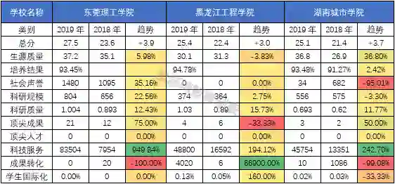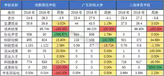 无独有偶,和排名上升的顶尖大学呈现一样的规律,排名上升幅度最大的三所大学也在科技服务(企业科研经费·千元)这一指标上有较为明显的上浮。而排名下降幅度最大的三所大学很多数据都是0或者空着,尤其是培养结果这一栏,三所大学2019年的数据显示为空。拿上海体育学院为例,其除了培养结果这一指标外其余指标相对去年都是上升或者持平,但是总分却少了将近4分,这和缺失的培养结果数据必然有直接的联系。榜单中200名之后的高校很多都面临这个共性问题,就是很多数据是没有的,这就导致了其中某一项指标对该校的整体得分可能产生决定性影响。并且和顶尖大学的指标变化趋势对比就会发现,这些变化幅度较大的高校有些指标变动的幅度也是非常夸张。这些问题都难以避免的会造成对大学评价的偏颇,也会向大众传递错误的信息。