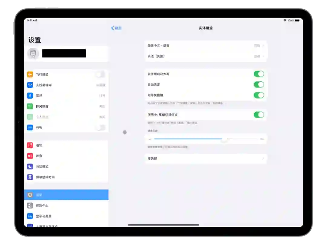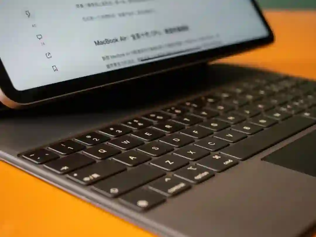 拥有 1mm 键程的键盘手感则要比之前的键盘式智能双面夹好太多,打字感受和 16 英寸 MacBook Pro 基本一样,键盘布局也和 MacBook 差不多,使用了「倒 T 型」方向键,不过由于没有最上方的一排功能键,所以键盘的背光亮度需要到系统设置内调整。