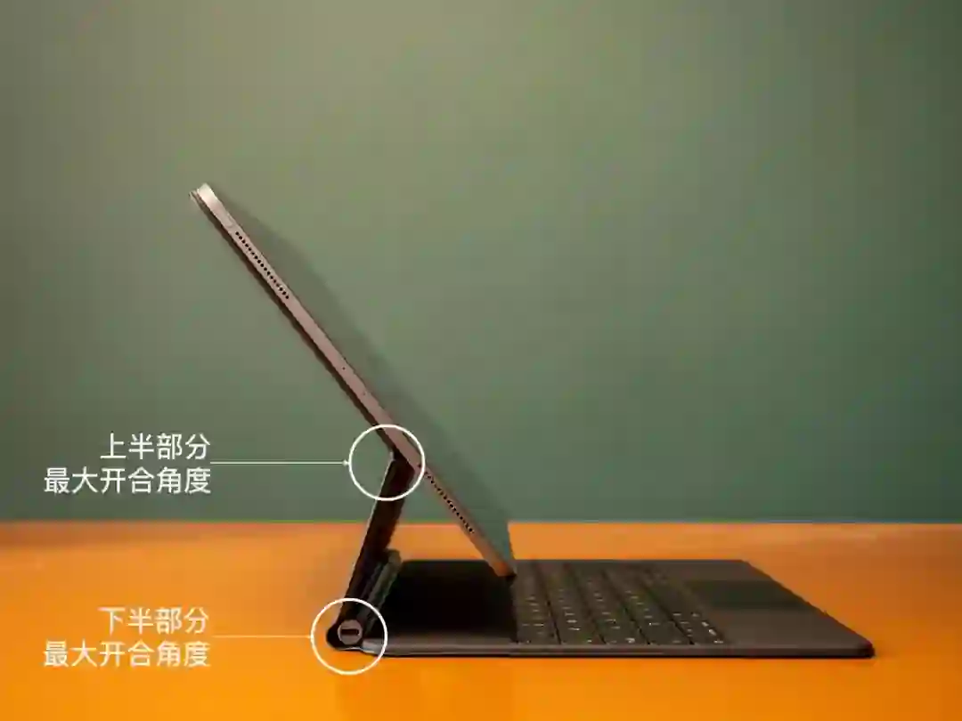 开合角度,我们需要分两部分讲,连接键盘部分的转轴(带有 USB-C 接口那部分)开合角度不到 90 度,可以将 iPad Pro 的高度提高 1cm。也就是说你不能像之前用键盘式智能双面夹那样将键盘壳完全摊平,或翻折到背面使用。尽管只提高了 1cm,但视觉体验也比旧款强不少,而且只有这个地方固定住了,背部转轴提供的悬浮和多角度调节才能实现。