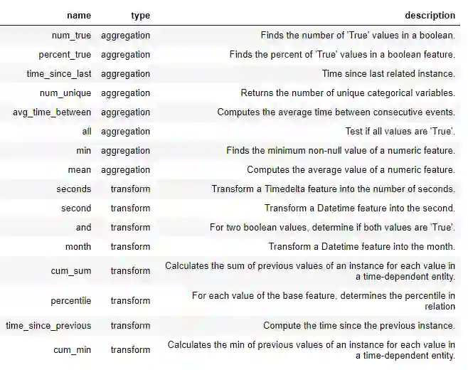 在特征工具中,我们可以通过单个基元或者叠加多个基元来构造新特征。下面是特征工具中一些特征基元的列表(我们也可以自定义基元):