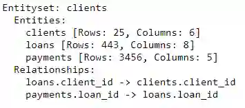 若要标明特征工具中的关联,我们只需指定连接两张表的变量。表 clients 和表 loans 是通过变量 client_id 相关联的,表 loans 和表 payments 通过 loan_id 相关联。可通过如下语法创建关联并将其加入实体集: