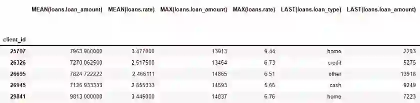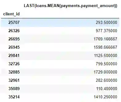 例如,MEAN(payments.payment_amount) 列是一个深度为 1 的深度特征,因为它在构造过程中只使用了一个聚合基元。LAST(loans(MEAN(payments.payment_amount)) 是一个深度为 2 的特征,它由两个聚合基元叠加构成:将 LAST 叠加在了 MEAN 上。这个特征代表客户最近一笔支付额的平均值。