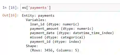 loans 数据框也有唯一索引 loan_id,将其加入实体集的语法和处理 clients 的语法相同。然而,payments 数据框中没有唯一的索引。若我们想把这个实体加入实体集,则需要让 make_index = True,并指定一个索引名。虽然特征工具可以自动推断实体中每一列的数据类型,但我们也可以通过把数据类型字典传入参数 variable_types 来将其覆盖。