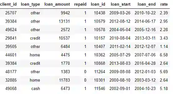 loans:客户名下的贷款。每笔贷款只对应表中的一行数据,但每位客户名下可能有多笔贷款。