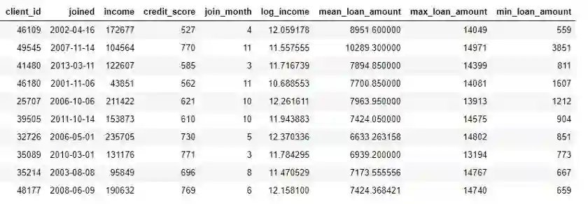这一过程包括根据不同用户对贷款数据表进行分组,计算聚合后的统计量,然后把结果整合到客户数据中。以下是我们在 Python 中用 Pandas 执行此过程的代码: