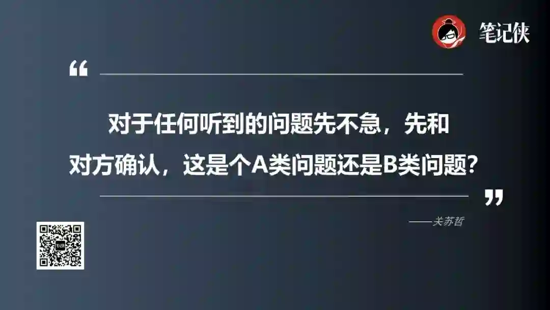 我在伟事达学到的,就是对于任何听到的问题先不急,不会马上和对方就事论事讨论,而是先和对方确认,这是个A类问题还是B类问题?