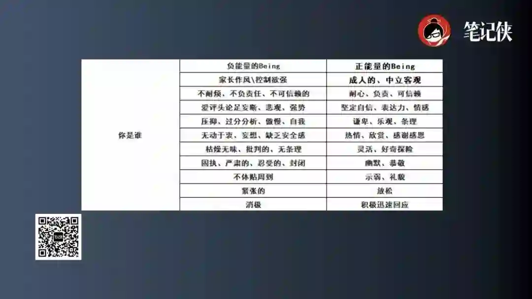 Being,是内在的心智模式和能量状态,是灵性、灵魂、生命能量、精髓、核心、存在,外在的being是展现出来的性格,而内在的being 是心智模式,如信念 ( Belief)、价值观( value )、规则准则(rule)。