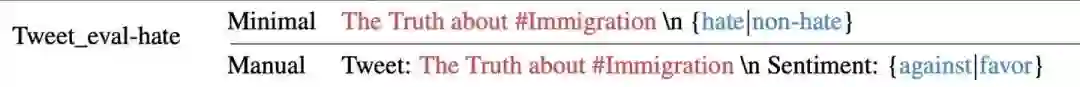 大规模预训练模型的无监督预测:对预训练好的语言模型,输入测试数据的输入(x),直接通过语言模型预测输出(P(y|x))。如下图所示。其中minimal是最简单的方式,mannual是加入人工设计的部分。蓝色是需要预测的标签部分。这篇论文中,作者默认采用Minimal的方式处理测试数据。