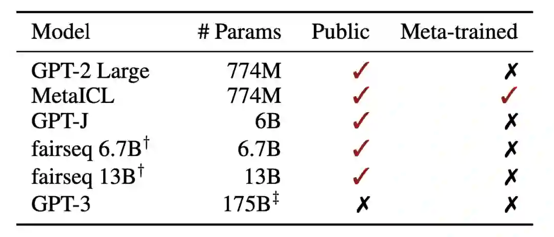 本文主要探究了6种不同的预训练模型,其中,MetaICL采用了大量的下游任务以in-context learning的形式进行了元学习:
