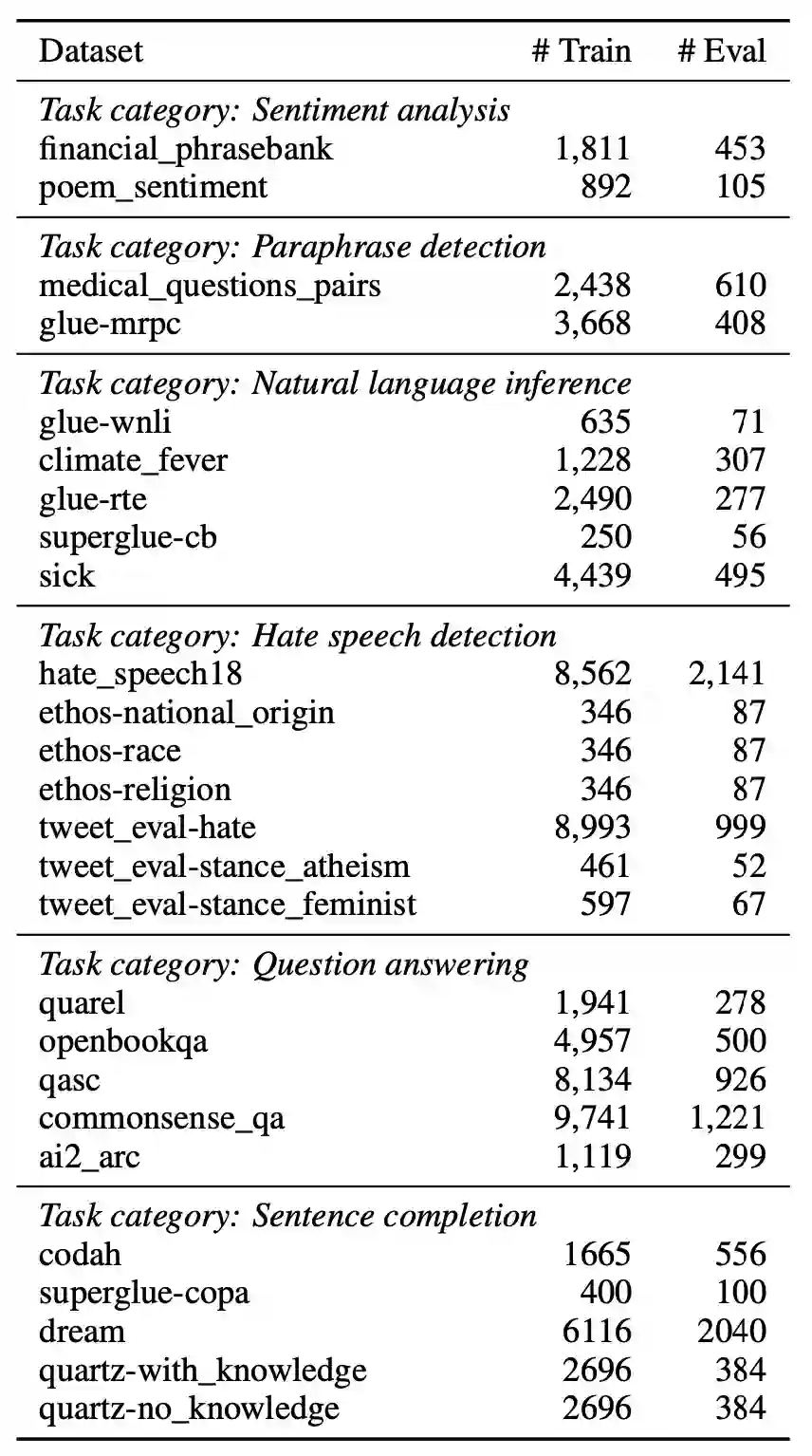作者一共探究了26个数据集,其中16个分类任务和10个多项选择任务。