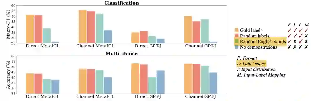 通过给in-context的训练样本赋予随机标签,可以构建随机标注的设置。从下图中可以看出,无论是分类任务(上),还是多项选择任务(下),随机标注设置下(红)模型表现均和正确标注(黄)表现相当,且明显超过没有in-context样本的zero-shot 设置(蓝)。