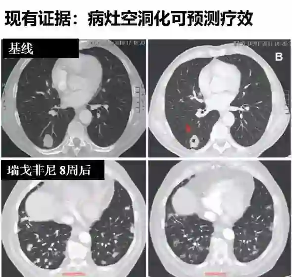 上述意见主要来自瑞戈非尼最新的三项研究数据。2017ESMO年会公布的一项研究显示,瑞戈非尼三线治疗转移性结直肠癌的长应答中位OS达18.7个月,其中,体能状况好、单纯肺转移、疾病进展慢的转移性结直肠癌患者的长应答率显著更高,说明3线及以上瑞戈非尼治疗对结直肠癌单纯肺转移者的疗效更优(图1)。回顾性分析则证实,肺转移灶密度减小可预测瑞戈非尼疗效。研究者回顾性分析了CORRECT和CONSIGN研究中,接受瑞戈非尼或安慰剂治疗患者的基线和8周时的CT资料,由独立放射科医师在盲态下评估治疗方案,结果瑞戈非尼治疗8周时,肺转移灶密度减小≥15%的转移性结直肠癌,其疾病进展风险更低,总生存更优。另有证据证实,肺转移病灶空洞化可预测瑞戈非尼疗效(图2)。