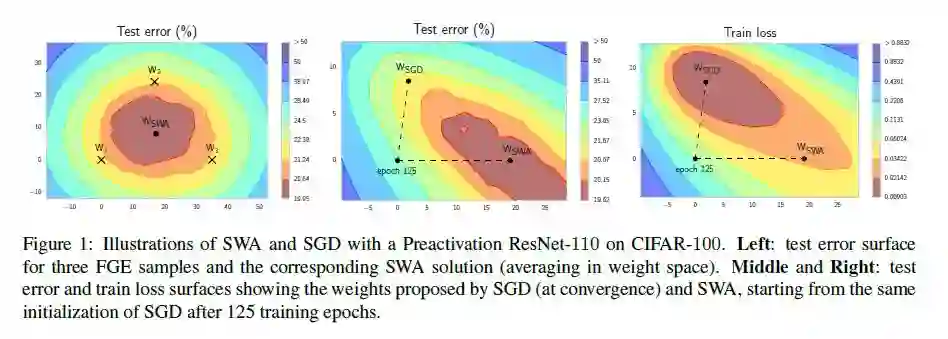摘要:深度神经网络通常通过采用带衰减学习率的随机梯度下降法(SGD)来最大或最小化模型的损失函数,以此来优化模型参数。结果表明,当学习率为常值或循环变化时,简单平均SGD寻优轨迹上的多个点,比常规训练取得更好的泛化能力。我们还表明,这种随机加权平均(Stochastic Weight Averaging, SWA )方法比SGD方法具有更宽的优化范围(broader optima),并且与最近提出的单模型Fast Geometric Ensembling( FGE )方法近似。使用SWA,我们在CIFAR - 10、CIFAR - 100和ImageNet上的一系列最优的Residual Network、PyramidNets、DenseNets和Shake-Shake network上的测试精度比常规SGD训练有显著提高。总之,SWA非常容易实现,明显提高了泛化能力,并且几乎没有计算开销。