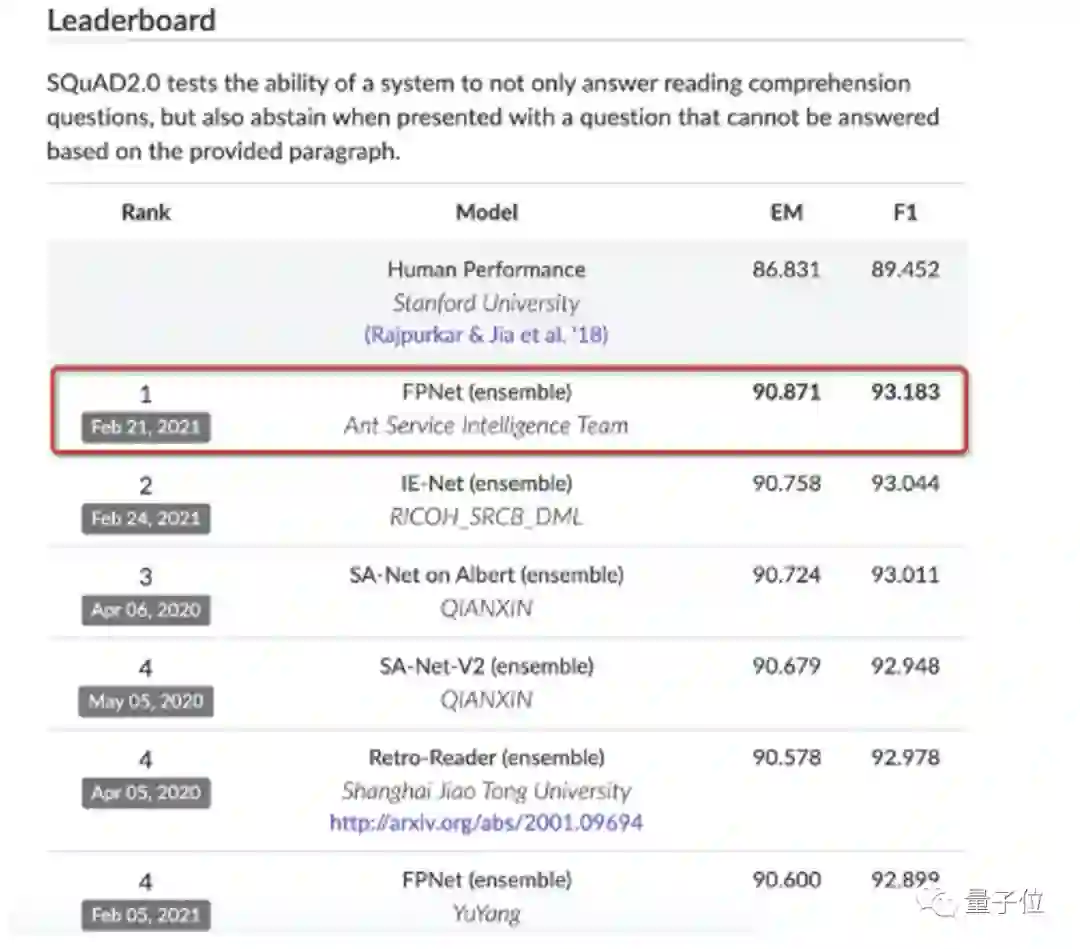 公开资料显示,在今年2月,支小宝团队以EM 90.871和F1 93.183的成绩,登顶SQuAD 2.0排行榜。