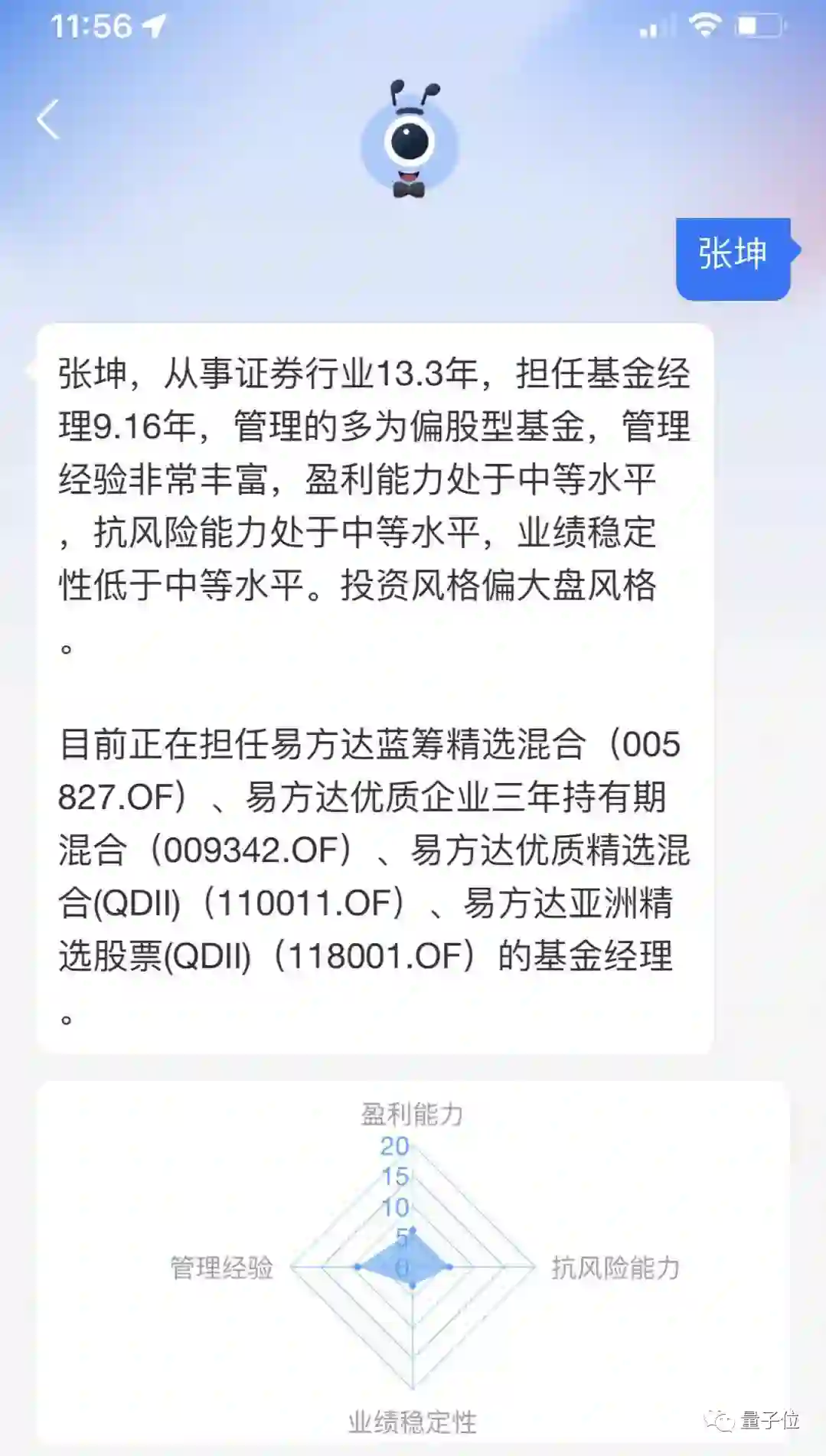 好家伙,支小宝似乎秒懂我意,一下子就把这位顶流基金经理的从业经理、能力画像都给到位了。