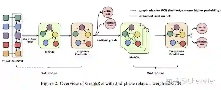 包含两阶段预测的GraphRel整体结构图如图2所示。在第一阶段,我们通过Bi-RNN和GCN抽取顺序和区域依赖特征。然后我们就可以预测实体和每个单词对之间的关系。在第二阶段,基于第一阶段的预测,我们对每种关系构建了完整的关系图,然后我们使用GCN融合每种关系的信息,并且考虑到了实体和关系之间的交互信息。