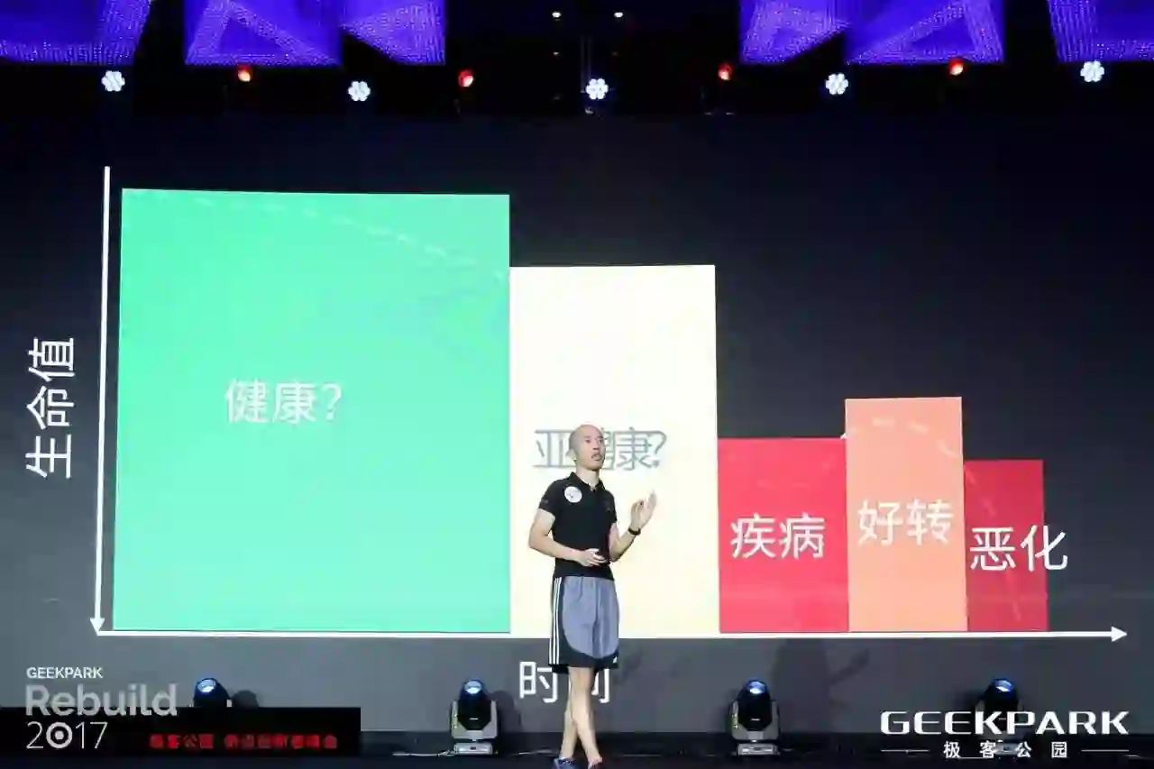 数据能够帮助我们从定性到定量来重新审视生命。在我们的眼中,生命是一个生老病死的过程,人从健康逐年积累到亚健康的状态,某一天突然生病,然后经过治疗病情好转,再逐渐病发或者衰老,逐渐走向死亡,这是通常情况下一个人的生命历程。但如果我们可以构建一个数字的生命模型,我们就可以按照时间来将我们的生命指数画出来,从而了解自己在每一刻、每一时分都处在怎样的状态中。