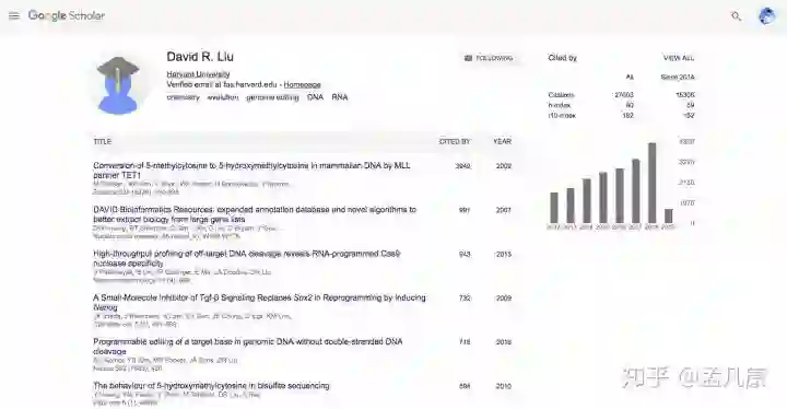 我个人的经验是,想要去系统的搜索一个人代表性工作,那么谷歌学术的学者页一定是最好的选择之一。谷歌学术搜索David R. Liu,第一个搜索就会推荐这位学者的主页,点进去就可以看到这个人的所有工作,而且可以以两种方式进行排序,一是以时间,可以看到从最新的一篇文章开始到其第一篇科研工作发表的时间内所有文章的先后顺序。第二种就是以引用量才做排序。
