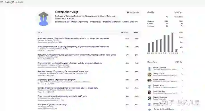 2. 平时要注意关注本领域的一些顶级科学家,比如我所在领域的Chris Voigt,James Collins等等。在谷歌建立的学者页会有列出所有相关的文章,按照引用率的排序,一般引用率比较高的都属于非常好的文章,可以作为经典来读。