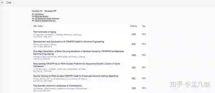 3. 同时无论是谷歌学术搜索都会给出某领域或者某杂志的引用率最高的文章排序,这种以引用率为评价标准的一般问题都不大。比如Cell引用率最高的几篇文章: