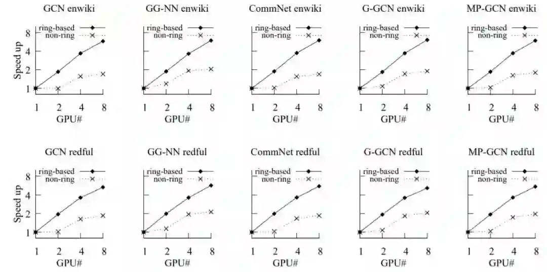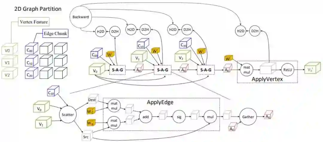 上的情况一样,高效使用 GPU 对 GNN 的性能至关重要,而且由于处理大型图结构的额外挑战,对 GPU 的使用就显得更为关键了。为了实现超越 GPU 物理限制的可扩展性,NGra 显式地将图结构划分(顶点和边数据)成块,将一个在 SAGA-NN 模型中表达的 GNN 算法转成了具有块粒度 operator 的数据流图,通过该数据流图,作者可以在单个或多个 GPU 上进行基于块的并行流处理。