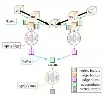 表示为顶点程序,其每一层都具有定义好的(结果分发、应用边、信息收集、应用顶点)图操作阶段。该模型不仅可以直观地表示 GNN,而且便于