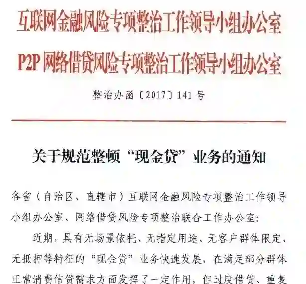 12月1日,监管部门下发《关于规范整顿“现金贷”业务的通知》,对中国现金贷公司、网络小贷平台进行全面整顿,要求持牌经营、利率限制、催收规范,停发无场景依托、无指定用途的网络小额贷款。紧接着,12月8日,银监会又印发《小额贷款公司网络小额贷款业务风险专项整治实施方案》,严格审批网络小额贷款资质,规范网络小额贷款经营行为,打击和取缔非法经营网络小额贷款的机构,并要求2018年1月底前完成摸底排查。