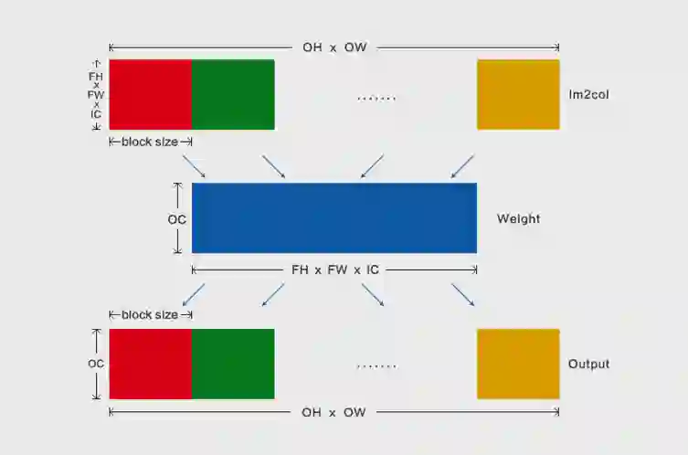 Im2col+MatMul是一种针对深度神经网络卷积计算的高效实践方法。Im2col(Image to Column)把输入feature map按照卷积核的形式一一展开并拼接成列,接着通过高性能MatMul(Matrix Multiplication) Kernel 进行矩阵乘,得到输出feature map,具体原理可参考论文[1