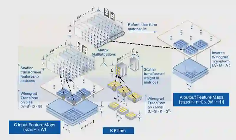 在深度神经网络中,卷积计算占据了绝大部分的时/空复杂度,Im2col+MatMul可以提高访存友好性,但无益于时间复杂度的减少,因此卷积计算优化实践中诞生了Winograd算法,具体数学原理可参见论文[2]。