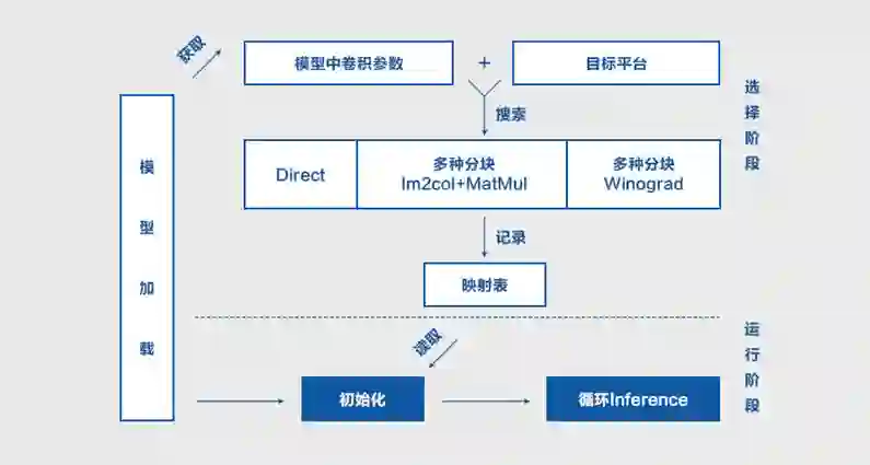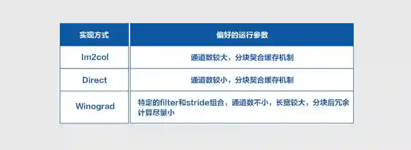 卷积计算有多种优化实现,侧重点也各有不同,比如Im2col可以平衡内存占用和运行速度,Direct直接进行卷积计算优化,Winograd则是优化计算复杂度。每种优化实现都在特定的输入参数下有一定的优势,并随着推理平台的不同而发生变化,因此不够灵活,无法选择最优实现。上述实现的启发式偏好如下所示: