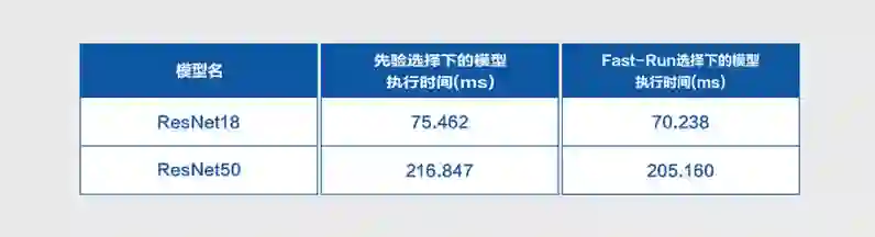 经典卷积网络上的实验测试证明了Fast-Run机制的自适应优势,优化效果明显,其模型执行效率优于先验选择下的执行效率,具体结果如下所示: