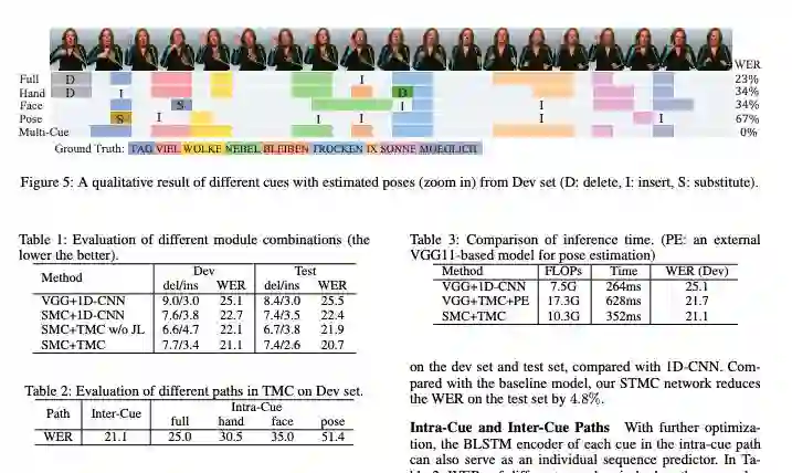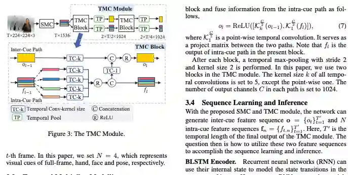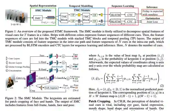 以往的深度学习模型在连续手语识别任务中只关注了最具区分性的特征,而忽略了其他视觉线索,例如手型、面部表情和身体姿势。这篇论文将多线索学习和神经网络相结合,提出了一个名为STMC的时空多线索网络来解决这个问题。STMC网络由空间多线索(SMC)模块和时间多线索(TMC)模块组成,其中SMC模块用于空间表示,并借助一个独立的姿势估计模块来分解不同线索的视觉特征,TMC模块沿两个平行路径对时间相关性进行建模。这篇论文还提出了一个联合优化策略来实现STMC的端到端学习。在三个大型CSLR基准上的实验结果表明这篇论文所提出的方法取得了最好的性能表现。