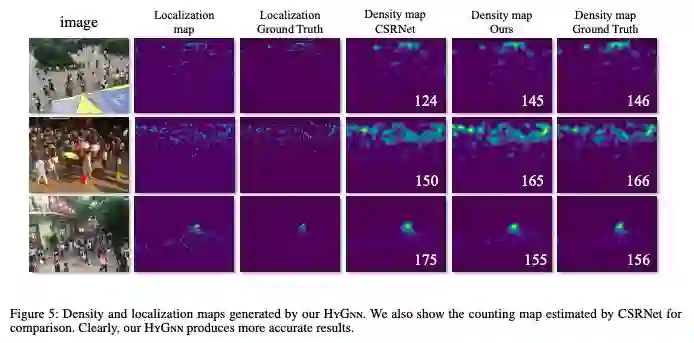 这篇论文提出了一个新的混合图神经网络(HyGnn)模型,通过将人群密度的多尺度特征及其辅助任务交织在一起。HyGnn集成了一个混合图,以将不同比例的特定于任务的特征图表示为节点,以及两种类型的关系作为边。这两种关系分别为:1、多尺度关系,用于捕获跨尺度的特征依赖关系;2、互利关系,为计数和本地化之间的合作搭建桥梁。通过消息传递,HyGnn可以提取节点之间的丰富关系以获得更强大的表示特征,从而获得可靠而准确的结果。HyGnn在ShanghaiTech Part A、ShanghaiTech Part B、UCF_CC_50和UCF_QNRF这四个具有挑战性的数据集上表现出色,超过了目前的最新方法。