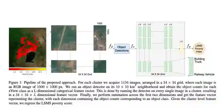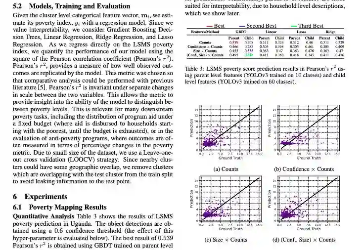 之前的研究中无法生成对政策制定者可解释的特征,限制了其应用。这篇论文提出了一个可解释的计算框架,通过在高分辨率卫星图像上进行目标检测,以准确预测区域级别的贫穷度。这个框架使用识别目标的加权计数作为特征,在预测乌干达的村级贫困程度时,模型比现有的基准方法提高了31%,并且有更好的解释性。