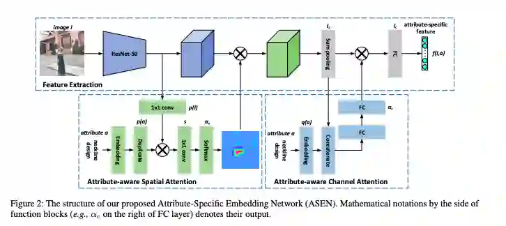 细粒度服饰相似度度量可以用于服饰相关的应用,例如服饰版权保护。这篇论文提出了名为ASEN的特定属性嵌入网络,来端到端联合学习多个指定属性嵌入,因此在相关空间能度量细粒度相似度。在使用基于属性的空间注意力与基于属性的通道注意力模块后,ASEN能定位到相关区域,并在特定属性的指引下捕获必要的模式,因此使得习得的属性特定嵌入信息能更好地表示细粒度相似度。这篇论文被AAAI 2020接收,作者也放出了数据和代码。