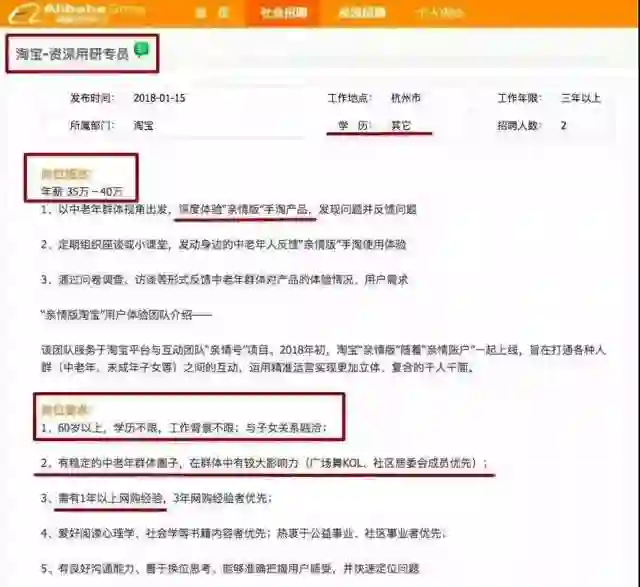 淘宝对“高薪+高龄”的解释则是,为了全面围绕中老年消费群体定制新的“亲情版”淘宝体验,从而打通长辈和子女之间的互动,进行千人千面的精准运营,而40万的年薪也代表了平台对这个岗位价值的合理判断。