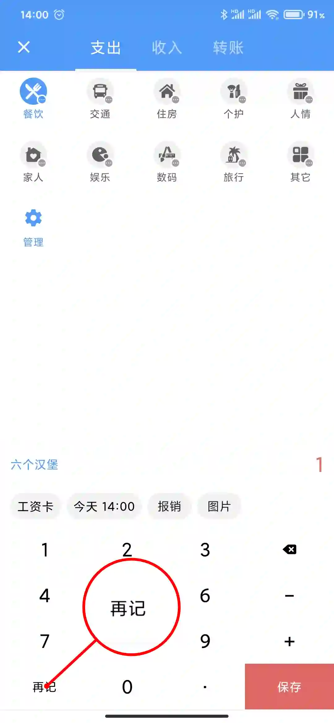在需要记录多笔消费或支出时,点击数字键盘左下角的「再记」按钮即可提交当前记录并自动进入下一笔记账的信息录入。