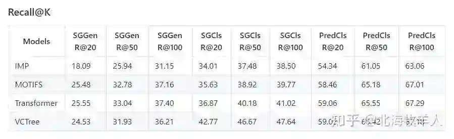 Zero Shot Recall@K (zR@K):在早期的视觉关系识别中,人们也使用了Zero Shot Recall指标,但在SGG中又渐渐被人忽视了,我们在这又重新增加了这个指标,因为它可以很好的展示SGG的拓展能力。Zero Shot Recall指的并不是从来没见过的relation,而只是在training中没见过的主语-谓语-宾语的三元组组合,所有单独的object和relation类别还是都见过的,不然就没法学了。